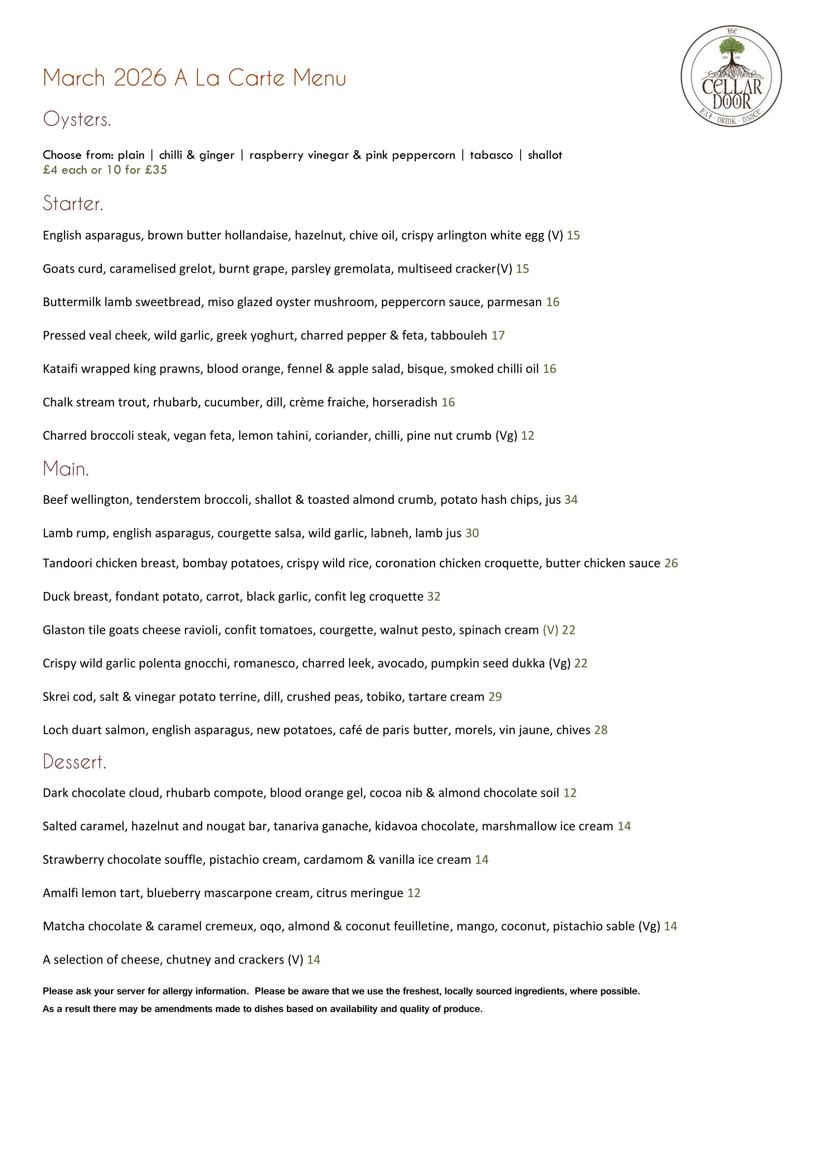 Sunday Lunch Menu